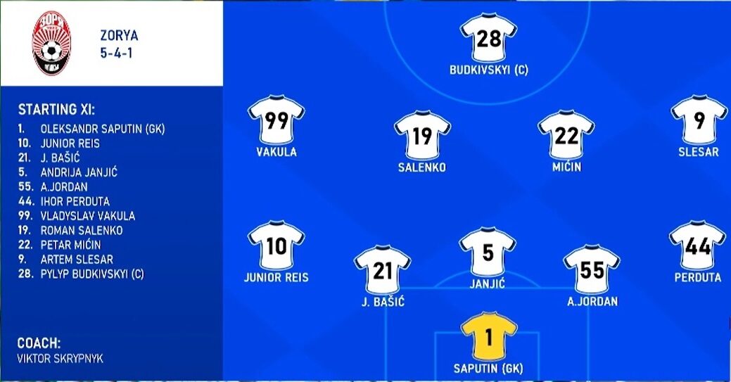 «Зоря»: Сапутін – Жуніньйо (Малиш, 76), Башич, Янич, Джордан, Пердута – Вакула (Горбач, 76), Саленко, Мічин (Руан, 76), Слесар – Будківський.